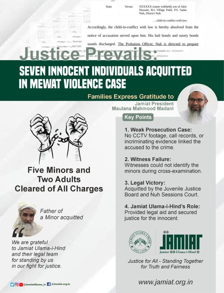 Dr. Priyank Jain, Principal Magistrate of the Juvenile Justice Board, Nuh, has acquitted five minors of all charges. Additionally, the Nuh Sessions Court has dismissed cases against two adults, Mohammad Majlis (Jai Singhpur) and Mehboob (Jai Singhpur).